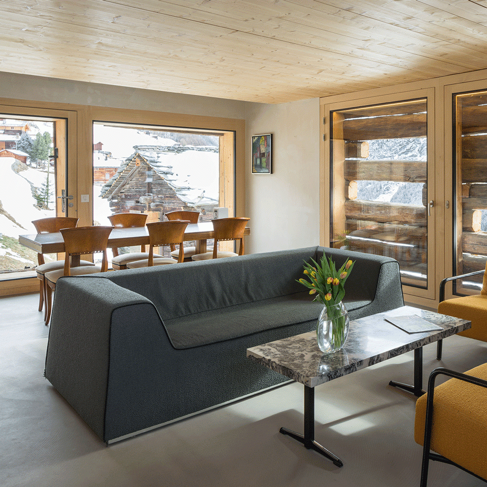 Ici, au fond de l’une des vallées les plus sauvages du Valais Suisse, au cœur d’un domaine skiable de poche (3 remontées seulement mais en réalité tout proche de domaines plus « achalandés) s’imbriquent conservation du patrimoine et architecture contemporaine. 7 mayens (des bâtiments agricoles séculaires, 2 raccards, 3 granges et 2 greniers) ont été sauvés de la destruction par un architecte à la fois idéaliste et visionnaire qui les a ensuite totalement projetés dans notre temps. Si @anakolodge, chaque fenêtre, chaque baie devient un tableau vivant, à l’intérieur s’associent aux bois tables en formica très fifties, bergères Louis XV en velours et canapés XXL en flanelle.