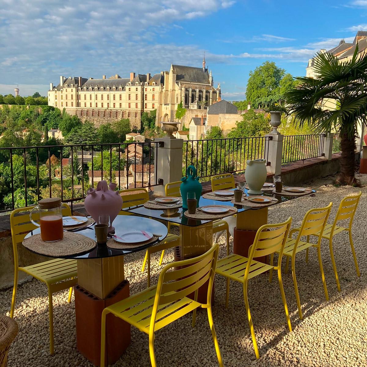 C’est un projet de vie, un projet de couple qui a mené Guillaume Dollinger et Alexandre Fleveau vers la ville historique de Thouars. Ils y ont acheté une vaste demeure, l’ont rénovée avec soin, habillée et meublée avec un goût sûr qu’ils ont affiné au cours de vies professionnelles mêlant mode, design et scénographie. Au Petit Thouars chaque pièce est un univers en soi, à chaque chambre sa couleur : mandarine, lavande, vert sombre ou amande, à chaque salle de bain son style : carrelée façon Jean-Pierre Raynaud ou dans l’esprit année 50. Éléments récupérées, objets chinés précieux ou simples, cohabitent en bonne entente. La maison propose une table d’hôtes, un jardin-terrasse avec vue sur la ville et une piscine complètent la proposition. Le charme inattendu d’une maison bourgeois