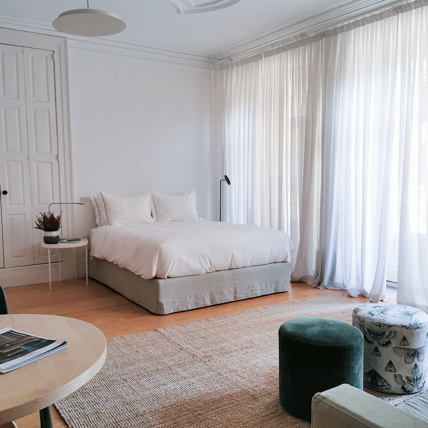Il fallait assurément avoir un grain de folie pour s’attaquer à un tel chantier. Redonner vie et sens à cet immeuble totalement délabré dans l’ancien quartier juif de Porto aura nécessité 2 ans de réflexion et d’études puis quasi 3 ans de travaux. Aujourd’hui ce sont en tout 7 appartements full équipés où l’atmosphère est épurée juste comme il faut, agrémentée de tons très subtilement poudrés, soulignée d’éléments d’origine (portes, volets, stucs) sauvés et repimpés. Le tout très lumineux et offrant des vues parfois assez saisissantes sur la ville.