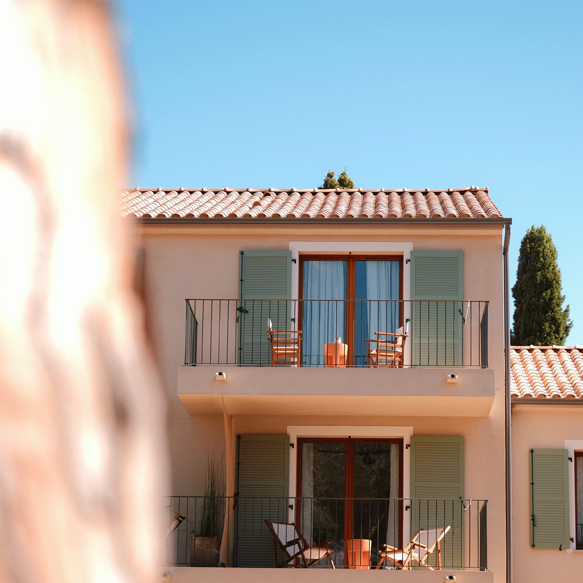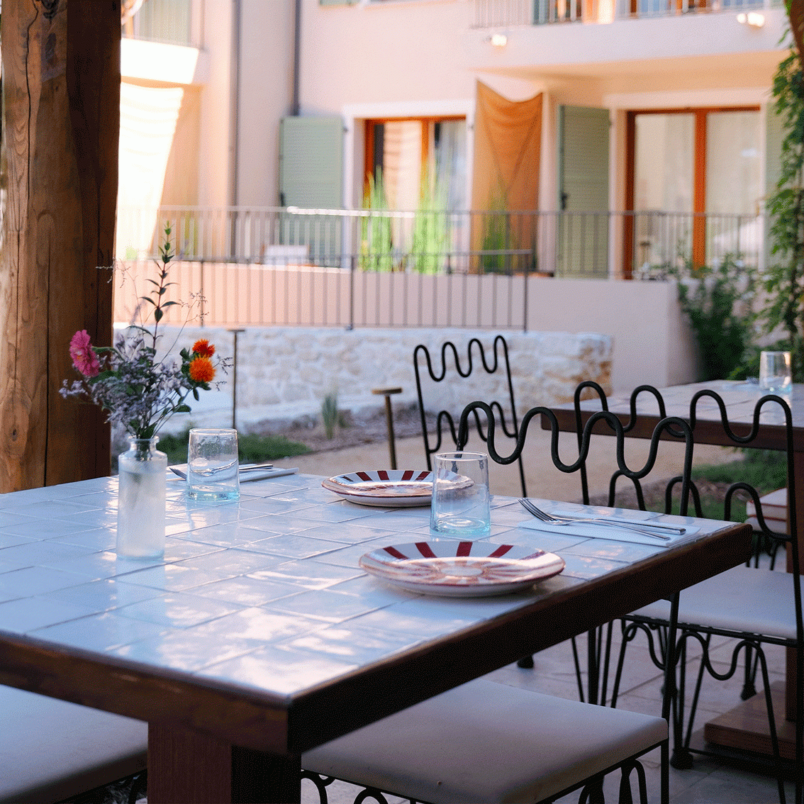 Quand on dit au revoir en Corse, avec la promesse de se revoir, avec surtout la marque d'une affection indélébile, on dit Basgi Basgi (prononcez "Baji Baji"). C'est sans aucun doute ce que souhaitent Coline et Matthieu: revoir leurs hôtes. Alors de cette ancienne cave viticole, posée en bordure de Saint-Florent, ils ont avec l'aide de l'architecte Marie Tomasini, de l'architecte d'intérieur Lea Ueshima, du cabinet de conseil Knoho studio, fait un lieu totalement à part et singulier. La lumière du Nebbiu n' y danse pas vraiment comme ailleurs, semblant rebondir sur les aplats, sur les courbes d'une lampe, sur les sols rayés en diagonale, sur les boiseries, entre les pins dans le jardin. Les inspirations sont multiples, mais clairement méditerranéennes, même quand elles pensent regarder du côté des Caraïbes. La volonté, elle, d'être le plus responsable possible est réelle; tant dans le choix des matériaux que des gestes quotidiens, notamment à La Table, emmenée par le complice Antonin Bergoin-Graziani et imaginée par le chef Anthony Deront.