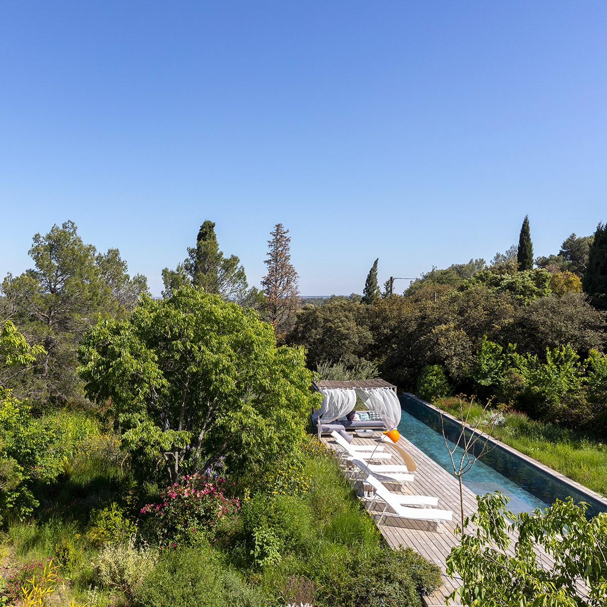 Chez Bien Loin d’Ici il y a tout ce qui se voit : des chambres luxueuses dotées d’une terrasse, spa et cabine de hammam, un jardin de garrigue et son couloir de nage. Mais il y a aussi ce qui ne se voit pas : une maison passive, bioclimatique et ses équipements techniques écoresponsables. Sans oublier la référence au poème de Charles Beaudelaire…