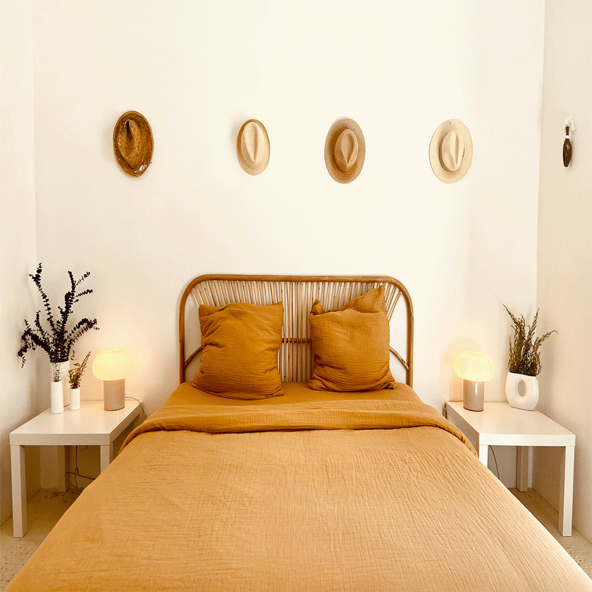 Derrière les volets vert passé, gros clins d’œil vers les seventies. Dans les volumes comme dans les formes. Jolies pièces de design, un peu de rotin en têtes de lit, beaucoup de blanc, puis quelques détails hors du temps, une baignoire à patte de lion, une photo très L.A., une cheminée en marbre ; l’ambiance à La Bastide Saint Martin est éclectique et souffle ici un vrai vent de liberté. Idéal pour l’été (on ne sait pas vous mais on y pense déjà, nous, à l’été 22) mais pas que… Point d’orgue de la maison, une immense pièce « cathédrale » qui semble avoir eu mille vies, autrefois magnanerie puis salle de tir…, aujourd’hui transformée en pièce à vivre taille XXL.