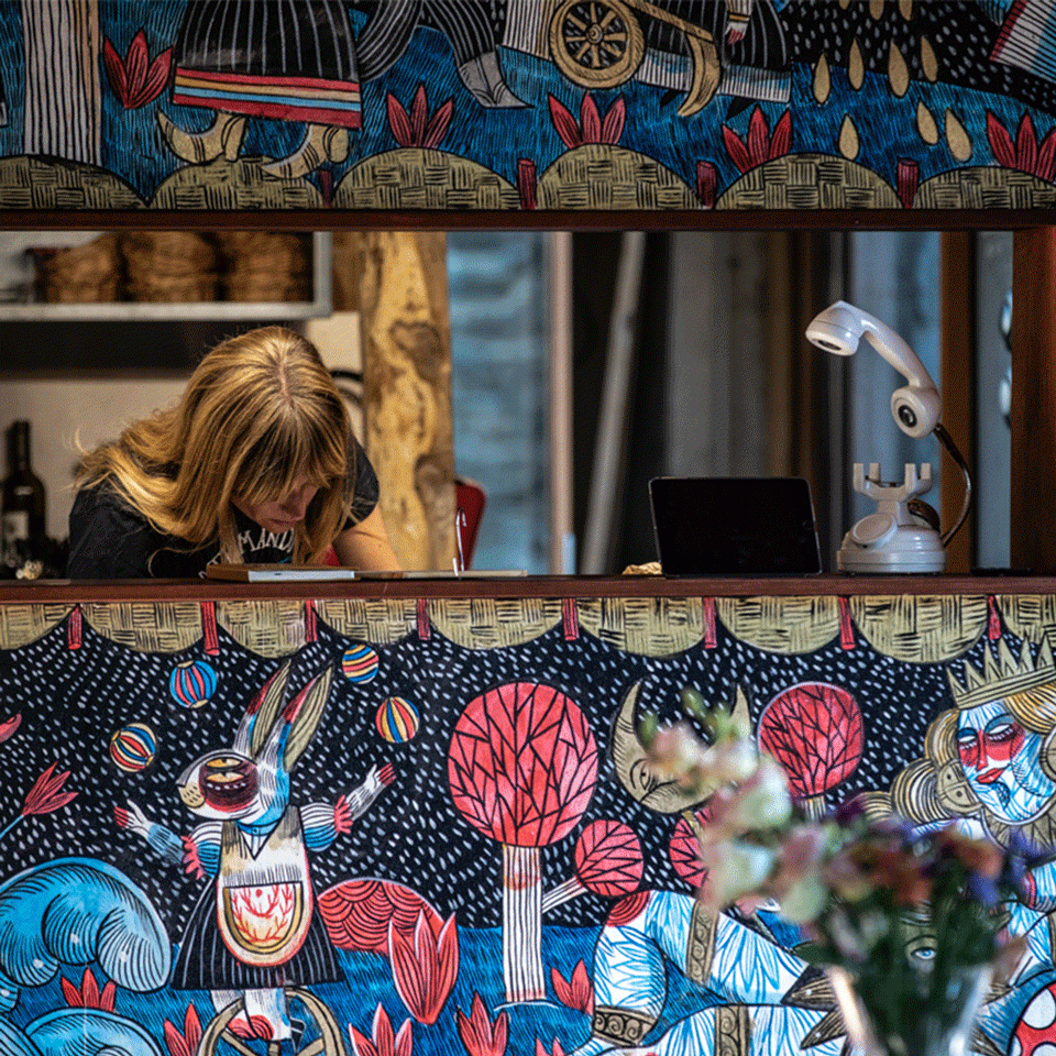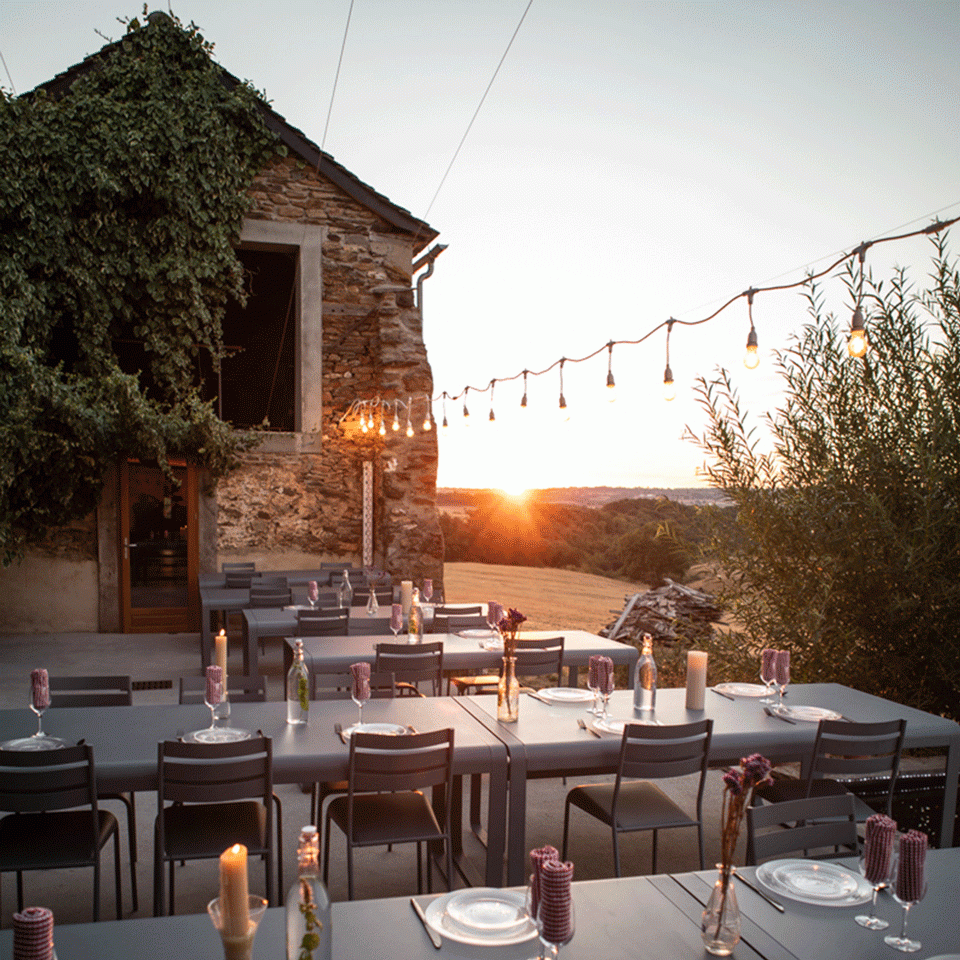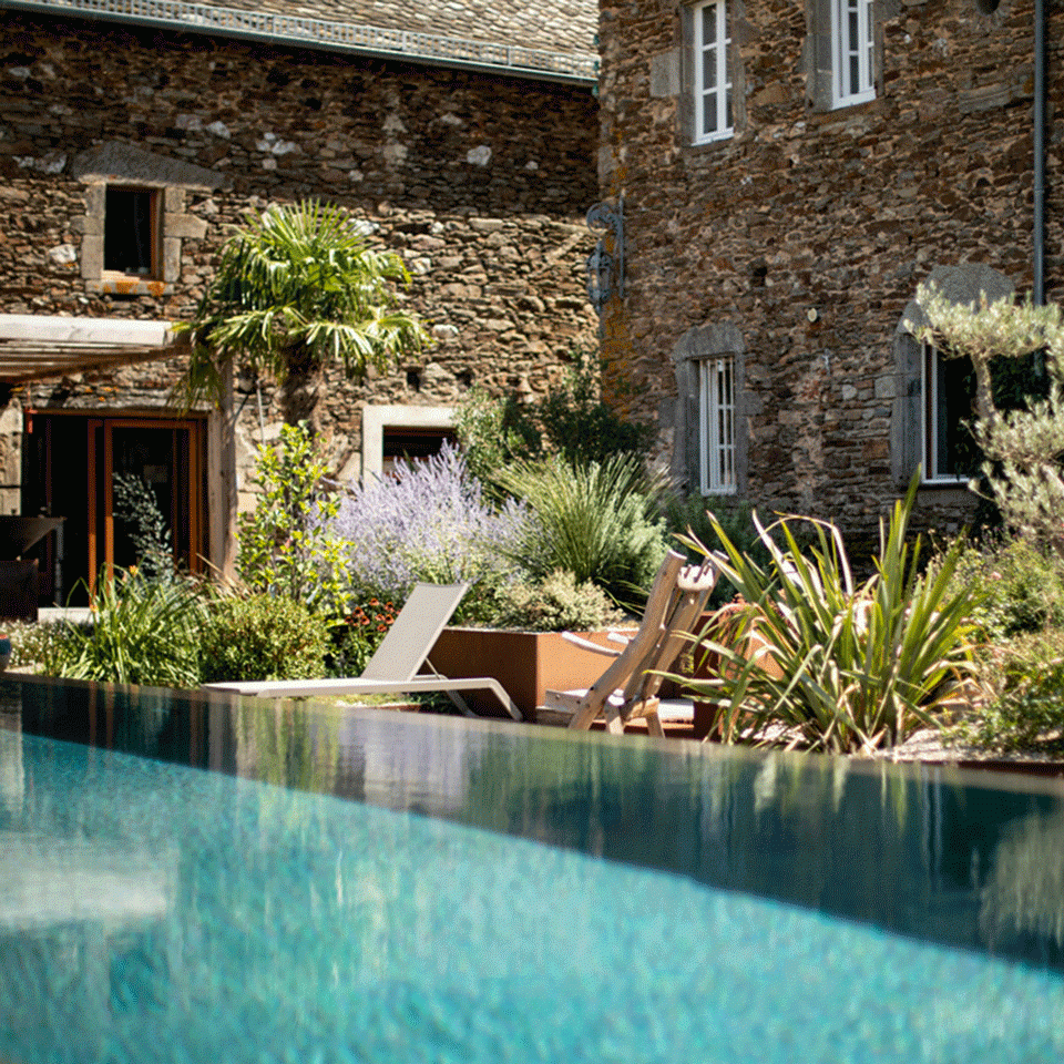 Autrefois il y avait au milieu de ces prairies un château. Il a depuis longtemps disparu. Restent ces prairies, désormais bio, une grange-étable, des arbres, une cour, une allée de tilleuls, un pigeonnier, une ferme. Le domaine s'offre une nouvelle vie sous l’impulsion de Nathalie et Didier. Une salle de réception, un restaurant éphémère (l’été) avec chef en résidence (Mélanie Duguès l’été dernier), des chambres XL où se mêlent le meilleur du design (signé Prouvé, Bertoia, Le Corbusier ou Dixon, rien que ça !) et matières biologiques et où tout est à vendre, un bassin de nage et un bain nordique des vergers en permaculture… Et ? Une vue, saisissante sur cette campagne du Ségala, n’en jetez plus !