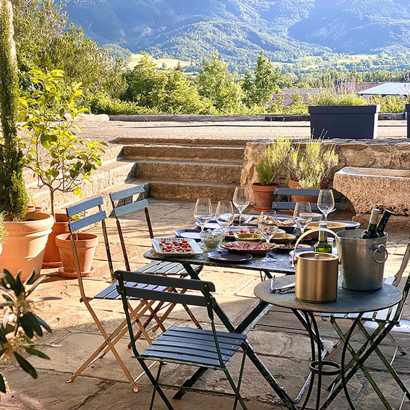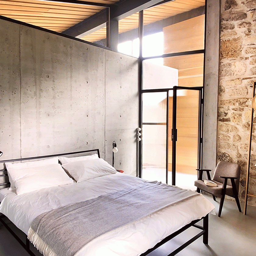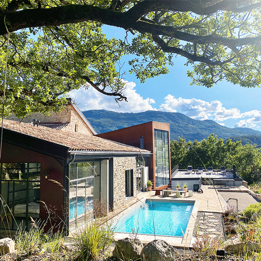 Voilà ce qui serait pour beaucoup la maison idéale.Ils se retrouveraient ici, dans La Maison du Murier, en grande tribu, dans des espaces généreux où tout ce dont ils auraient besoin serait là, à portée de main : piscine, terrain de pétanque, hot-tub chauffé au bois, four à pizza, cuisine extérieure, cave voutée…Les amoureux de vieilles pierres y admireraient celle des anciens murs, les fans d’architecture contemporaine s’extasieraient devant le vaste volume vitré et les murs de béton brut, les afficionados de design salueraient le choix de chaque pièce de mobilier. Et tous féliciteraient les propriétaires de cette maison, un couple anglo-japonais, pour l’ambition de ce projet et leur ténacité. Il leur a fallu en effet une douzaine d’années pour faire de ce corps de ferme du 17éme siècle partiellement démoli, un lieu de villégiature rêvé.