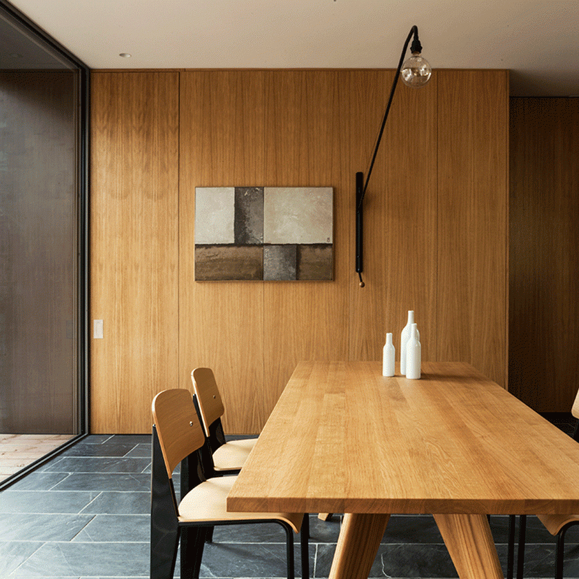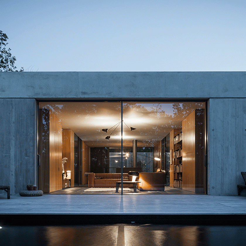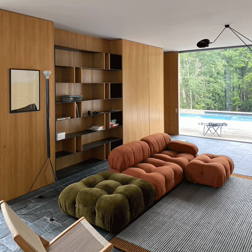 Un bois, un jardin, au milieu une clairière et au centre une maison en béton, brut, et verre. En forme H, d’où son nom, aussi bête que ca. Le cabinet d’architecte Atelierfm a imaginé ici un geste plein de pureté, véritable écrin pour un mobilier aussi bien siglé que signé. On pourrait voir là un hommage à Franck Llyod Wright dans cette association presque déroutante entre manifeste architectural et nature enveloppante. Va être aménagé très bientôt dans une dépendance un studio d’enregistrement, faisant de cette Maison H, un lieu idéal pour une résidence d’artiste.
