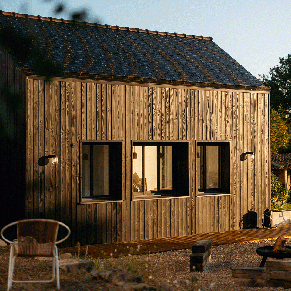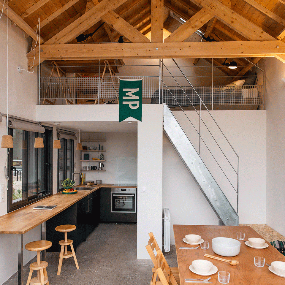 Une rivière (La Rivière de Crac’h), un lac (l’Etang du Moulin du Lac), un ponton et un peu plus loin, à portée de paddle sûrement, l’Anse de Kervilor puis La Trinité-sur-Mer, paradis des voileux et après la Pointe de Kerbihan la Baie de Quiberon. Et une maison blanche assortie d’un atelier en bois noir. Maison Passage est une maison de vacances où tout est soudain plus simple, plus facile, plus ouvert. Les couleurs sont primaires et les bois clairs, le mobilier un habile mélange de vintage et de pièces plus contemporaines, ajoutez quelques subtils jeux de rayures et vous avez l’esprit, à la fois balnéaire et lumineux. Et comme tout est pensé pour que ce soit modulaire, on peut y aller à 2, mais aussi en tribu ou en bande, avec chacun sa cuisine !