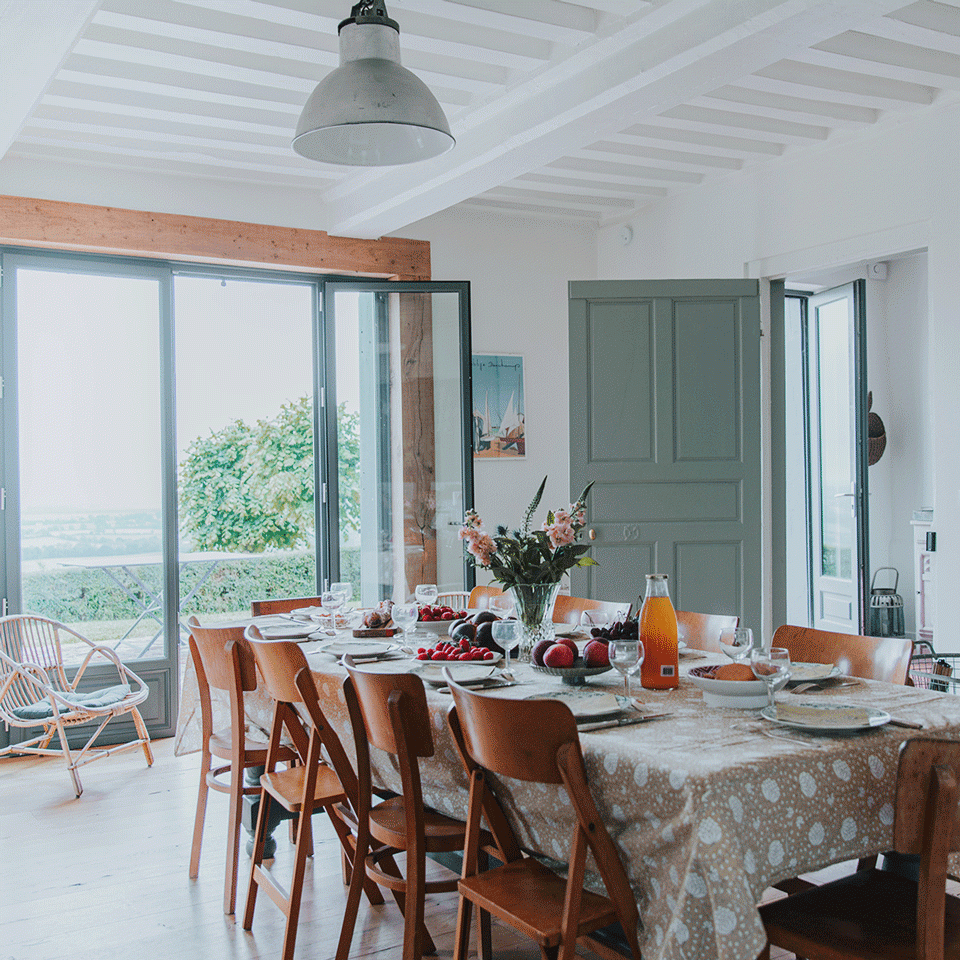 Un bocage et des châteaux, des champs et des vaches puis une maison 18ème trop longtemps abandonnée à laquelle elle a voulu redonner vie. Une tâche, longue et parfois ardue, à laquelle s’est attelée Nathalie. Murs bruts et aplats pastel, Chesterfield de cuir devant cheminée et buffet 50’ décapé et twisté, chaise à bascule et gravures chinées, étagères de rotin et bureau d’écolier… Elle a fait de La Maison Pomme la maison de campagne idéale, simple et cosy, cool et gaie, full équipée et avec vue. Last but not least, piscine et salle à manger extérieure pour les beaux jours…