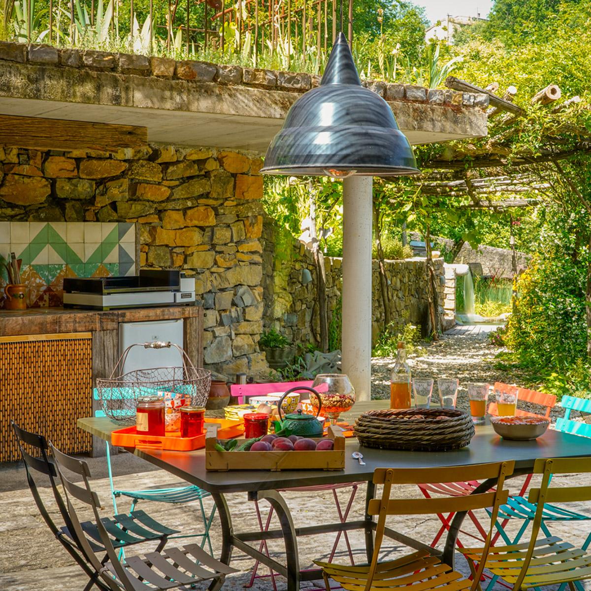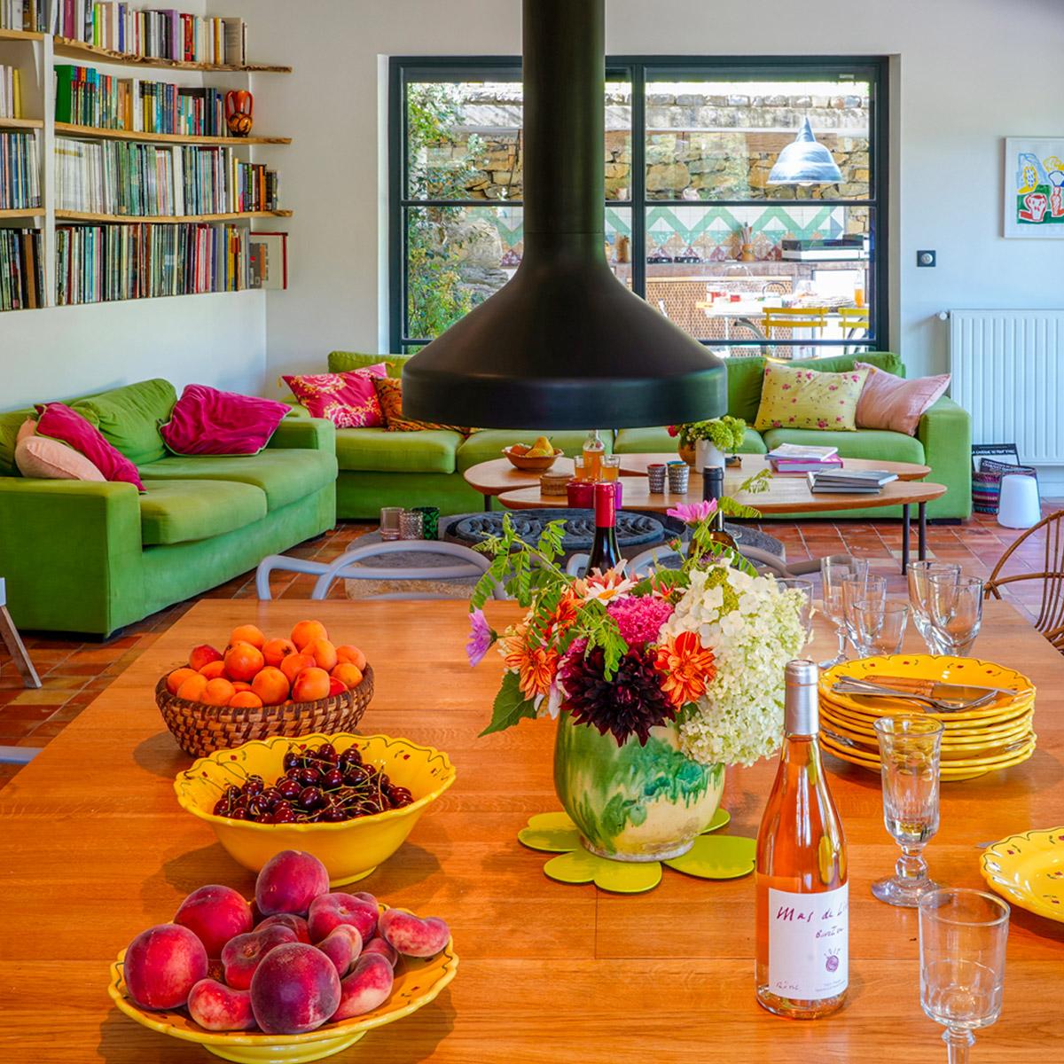 Autour d'une maison contemporaine noyée dans un vaste jardin méditerranéen, se déploie l'écosystèmedu Mas de Saribou : des murs de vieilles pierres,une piscine naturelle, un potager bio... Des matières naturelles, une déco colorée, une cheminée pour les soirées d'automne, un bonheur distillé dans le moindre détail par ses bienveillants propriétaires. Un art de vivre joyeux et écologique.